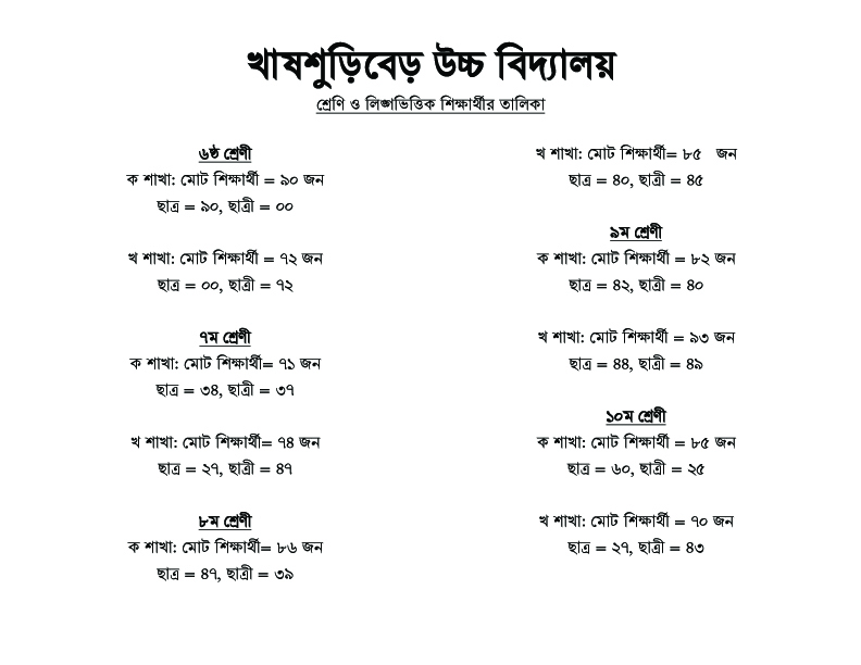 শ্রেণি ও লিঙ্গভিত্তিক শিক্ষার্থীর তালিকা